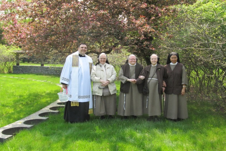Fr. Gregory Kalscheur, S.J. celebrated the Eucharist and happily joined us for a photo session afterward. Sister Mary Magdalen stands on his left, with Sister Clare Frances, our Abbess, on her left, and our Vicaress, Sister Mary Veronica, at his right.